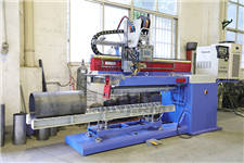 The longitudinal seam automatic welding machine is mainly used for welding thin plate longitudinal seams. It adopts a cantilever mechanism and is mainly composed of a frame, clamping mechanism, water-cooled mandrel, backing pad, shaft end bracket, traveling trolley, cross slide, wire feeding mechanism, and gun clamping device. The clamping mechanism uses compressed air to inflate a bladder, generating a maximum linear pressure of 2.5 kg/cm after the crack is formed. The left and right pressing distances are adjustable to accommodate different weld widths. The mandrel is designed with different diameters based on the length of the weld to ensure sufficient rigidity. The water-cooled backing pad of the mandrel is in close contact with the workpiece, and the pad is equipped with grooves and evenly distributed protective gas holes to ensure the formation and cooling of the backside of the weld. The vertical height of the mandrel is adjustable to suit welding on different plate surfaces. A traveling trolley is installed on the upper part of the frame beam, which moves linearly along the beam through a guide rail and drive mechanism, with speed controlled by a frequency converter.